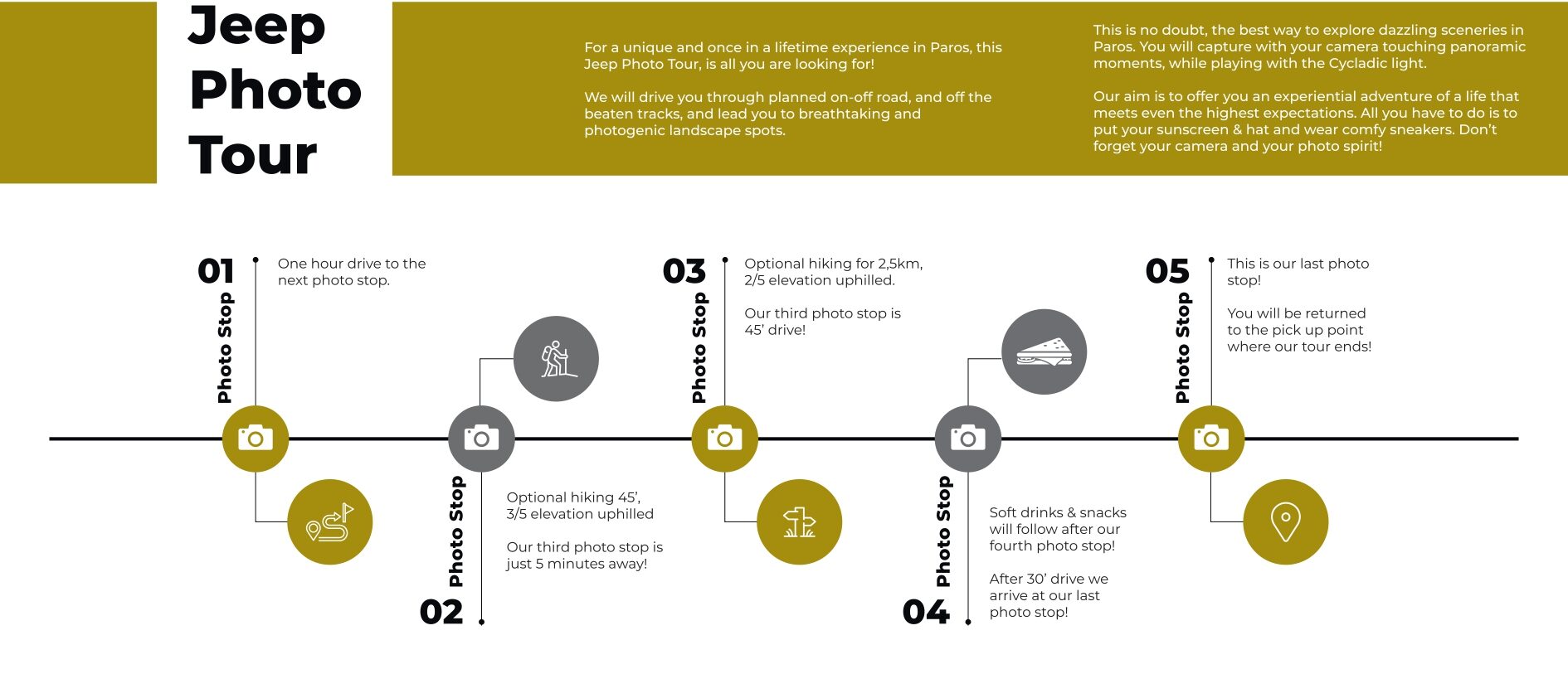 Ζήστε την Πάρο μέσα από έναν μοναδικό Jeep Photo Tour με έμπειρο οδηγό. Ανακαλύψτε κρυφές παραλίες, αυθεντικά τοπία και σημεία με εκπληκτική θέα, μακριά από τα συνηθισμένα. Ταξιδεύουμε άνετα με 4x4 Jeep και κάνουμε στάσεις στα πιο φωτογενή μέρη του νησιού, ιδανικά για αξέχαστες λήψεις και αυθεντικές εμπειρίες. Μια ξεχωριστή εκδρομή για λάτρεις της φύσης, της φωτογραφίας και της περιπέτειας.